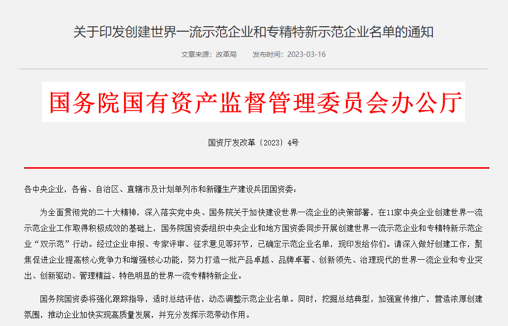 創(chuàng)建世界一流專(zhuān)精特新示范企業(yè)是國(guó)務(wù)院國(guó)資委貫徹黨中央、國(guó)務(wù)院關(guān)于加快建設(shè)世界一流企業(yè)決策部署,深化創(chuàng)建示范、管理提升、價(jià)值創(chuàng)造、品牌引領(lǐng)“四個(gè)專(zhuān)項(xiàng)行動(dòng)”的重要內(nèi)容,旨在選取全國(guó)范圍內(nèi)專(zhuān)業(yè)突出、創(chuàng)新驅(qū)動(dòng)、管理精益、特色明顯的世界一流專(zhuān)精特新企業(yè),發(fā)揮示范帶動(dòng)作用,推動(dòng)國(guó)資國(guó)企改革專(zhuān)項(xiàng)落地。