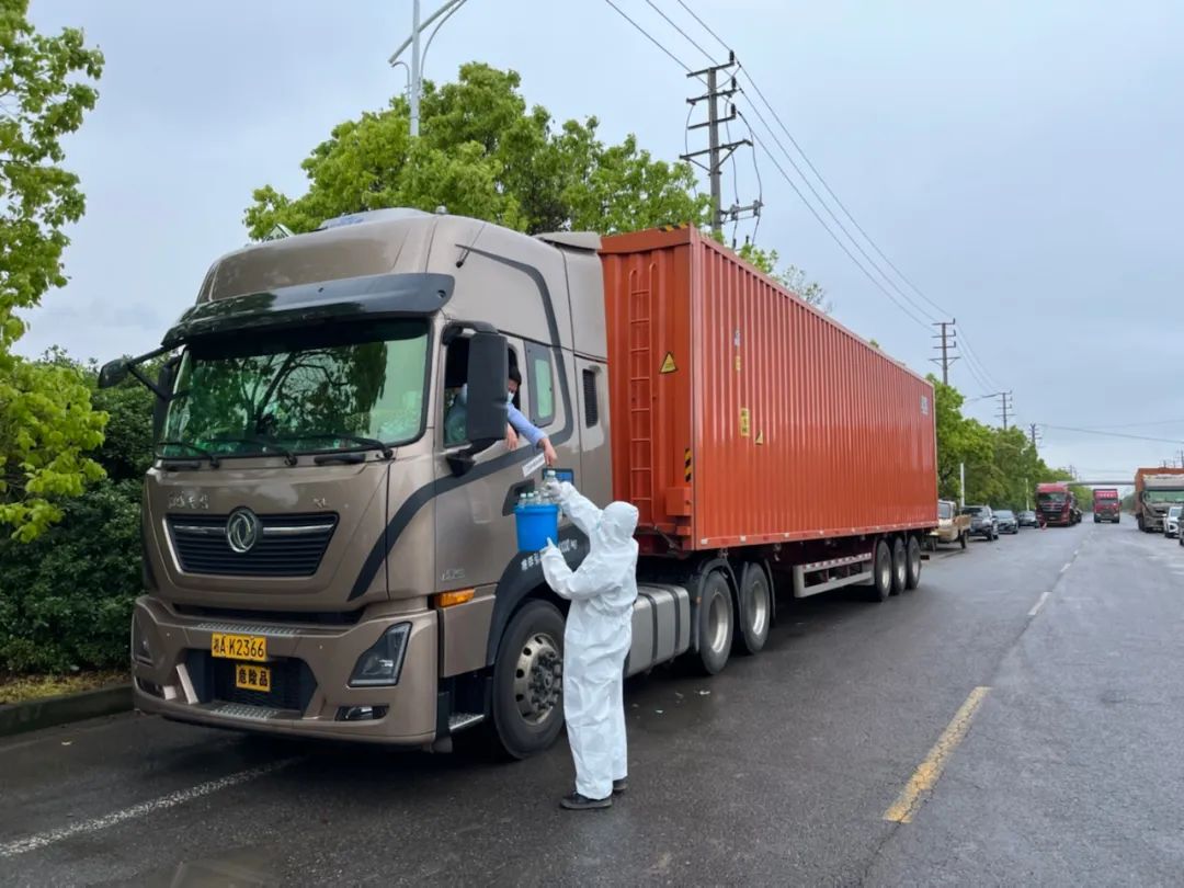 后勤人員在高速路口接車并為司機(jī)師傅送上防疫物資,讓服務(wù)更有溫度。